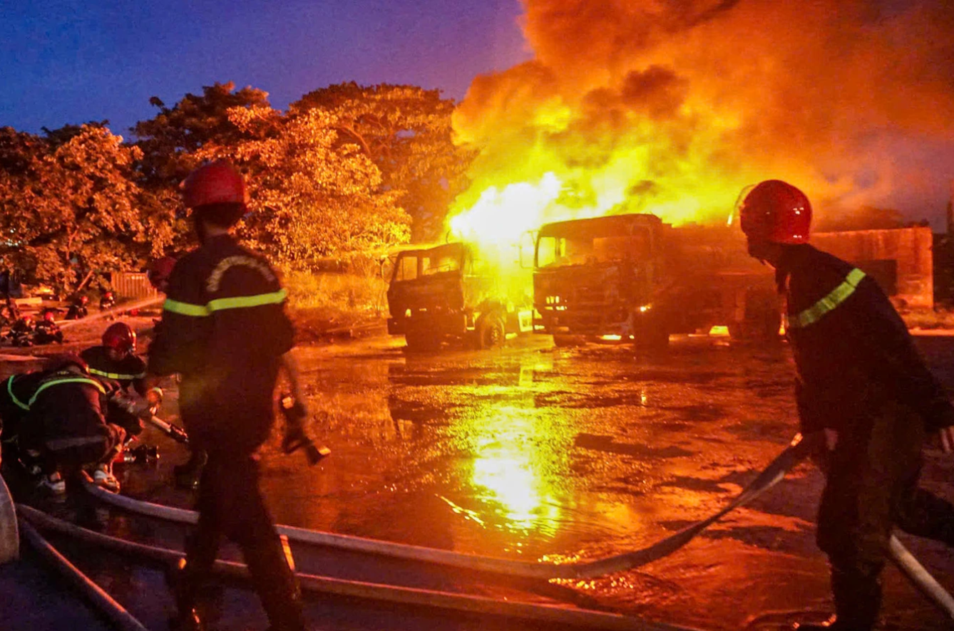 Một vụ cháy lớn xảy ra tại bãi xe phía sau cửa hàng xăng dầu ở thành phố Đà Nẵng. Lửa bao trùm 2 xe bồn và 1 thùng container bên trong chứa các phuy dầu, uy hiếp trực tiếp cây xăng.