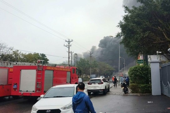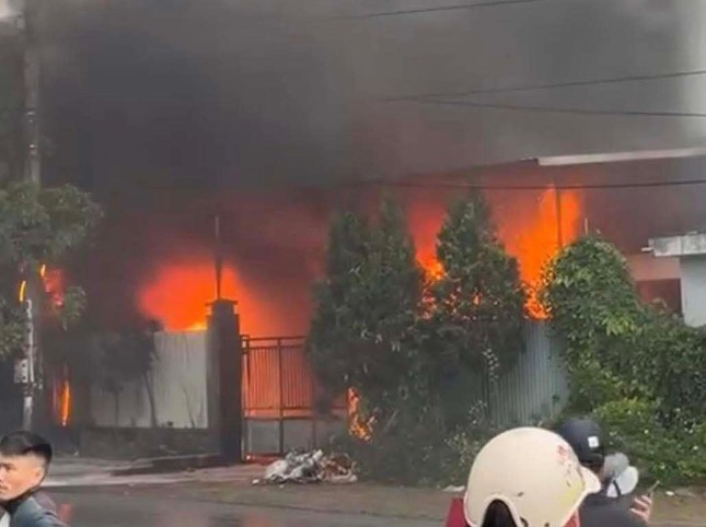 Ngọn lửa lớn bùng phát tại 1 công ty ở Khu công nghiệp Hòa Xá (phường Mỹ Xá, TP Nam Định), cột khói bốc cao hàng chục mét.