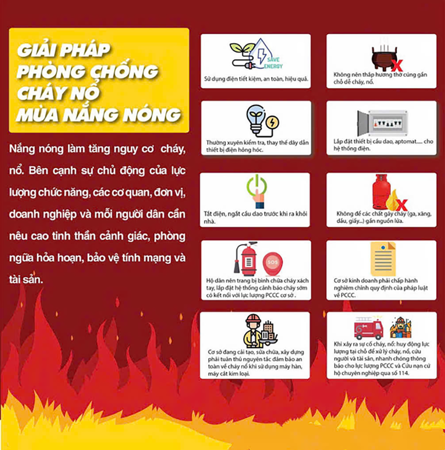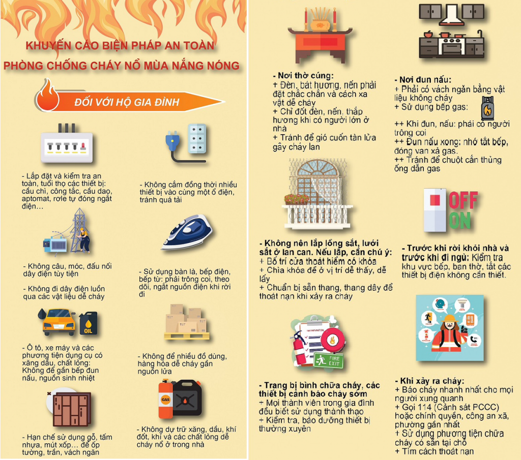 Đối với hộ gia đình: Thường xuyên kiểm tra các thiết bị điện, tránh để các sự cố chập cháy do hư hỏng và tuổi thọ của các thiết bị; kiểm tra, lắp đặt các thiết bị bảo vệ như: cầu chì, công tắc, cầu dao, attomat, rơle tự đóng ngắt điện, chống quá tải, chập cháy cho đường dây dây điện trong nhà và chống quá nhiệt cho từng thiết bị điện, đặc biệt là các thiết bị có công suất lớn (Dùng attomat bảo vệ có thông số phù hợp riêng cho từng phòng, cho từng thiết bị có công suất lớn như bình nóng lạnh, điều hòa…). Các hộ dân kiểm tra, bảo dưỡng các thiết bị sử dụng điện để lâu ngày không hoạt động khi bước vào mùa nắng nóng.