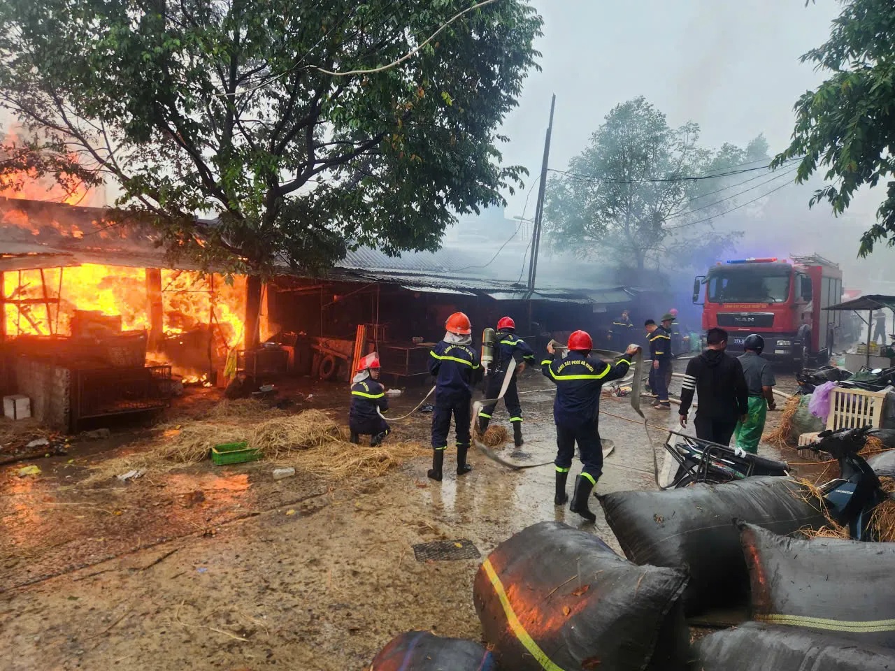 Khoảng 16 giờ ngày 17/8, dù trời mưa nhưng tại khu vực quầy hàng chuyên bán thịt chó thuộc chợ đầu mối Vinh (phường Trường Thi, Nghệ An) xảy ra đám cháy lớn.