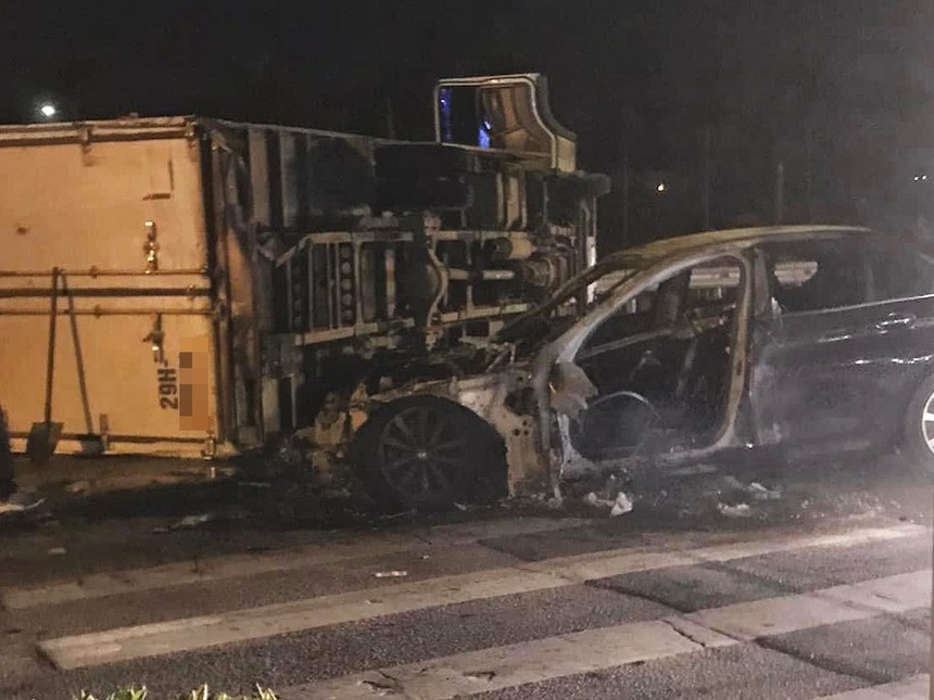 Cú tông mạnh khiến xe tải lật ngang, ôtô con bốc cháy. Ngọn lửa bùng lên nhanh, thiêu rụi một phần ôtô hiệu BMW. Sau tai nạn, hai ôtô nằm chắn hoàn toàn quốc lộ 5 hướng đi Hải Phòng.